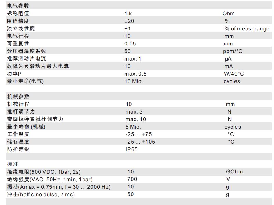瑞士CONTELEC直線傳感器,多種規格:0-10mm....100mm;使用壽命長:100000000次操作; 線性度好: +/-0.25%; 可帶復位彈簧。 KL系列直線位移傳感器;導電塑料電位器,壽命1千萬次;線性度±1%;防護等級IP65;測量行程:0-10/25/50/75/100mm。 該產品型號:KL100 1KO/M KL250 5KO/M KL500 5KO/M KL750 5KO/M KL1000 5KO/M KL100 1KO/M SEF KL250 5KO/M SEF KL500 5KO/M SEF KL750 5KO/M SEF KL1000 5KO/M SEF