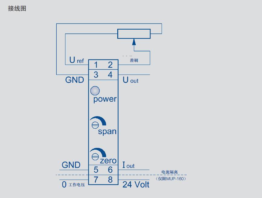 MUP110/160系列信號轉換器,德國原裝產品,專為電位計式傳感器和角位移傳感器配置的信號調節裝置,有電隔離型可供選擇(帶DC/DC變換器),標準輸出信號:0 ... 10 V,0 ... 20 mA ,4 ... 20 mA,極佳的線性度,極低的溫度漂移(典型溫漂值為20 ppm/K),標準導軌固定安裝,符合DIN EN 60175標準,體積小巧,寬度僅有12.6mm。