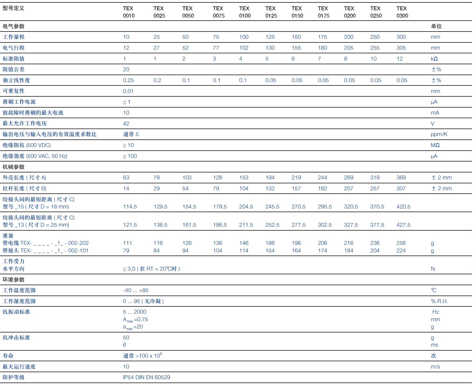 TEX系列傳感器直線位移傳感器,電位計式,帶球眼安裝接頭,工作量程可達300mm,防護等級IP54,具有設(shè)計緊湊、安裝簡易和價格低廉的特點,適合各種工業(yè)環(huán)境應用。該傳感器測量原理簡單,如無源、絕對值輸出等特點,使它不易受到電磁干擾,傳感器上電即讀實際位置數(shù)值。傳感器電氣連接可選擇徑向接頭或徑向/軸向電纜。其它類型的傳感器,如帶/不帶復位彈簧、安裝卡子、傳感器一端帶直出電纜或法蘭接頭等。 特點: ? 結(jié)構(gòu)緊湊 ? 防護等級IP54 ? 易于和帶側(cè)向受力緩沖的萬向頭連接,可以±12.5°范圍內(nèi)自由移動 ? 壽命長,不同應用條件下,最高可達1億次運動 ? 分辨率優(yōu)于 0.01 mm ? 線性優(yōu)異,達±0.05% ? 機械接口可按客戶要求定制 ? 任選輸出電纜或插頭連接方式 ? 如需防護等級IP67產(chǎn)品。請參見TX2產(chǎn)品資料