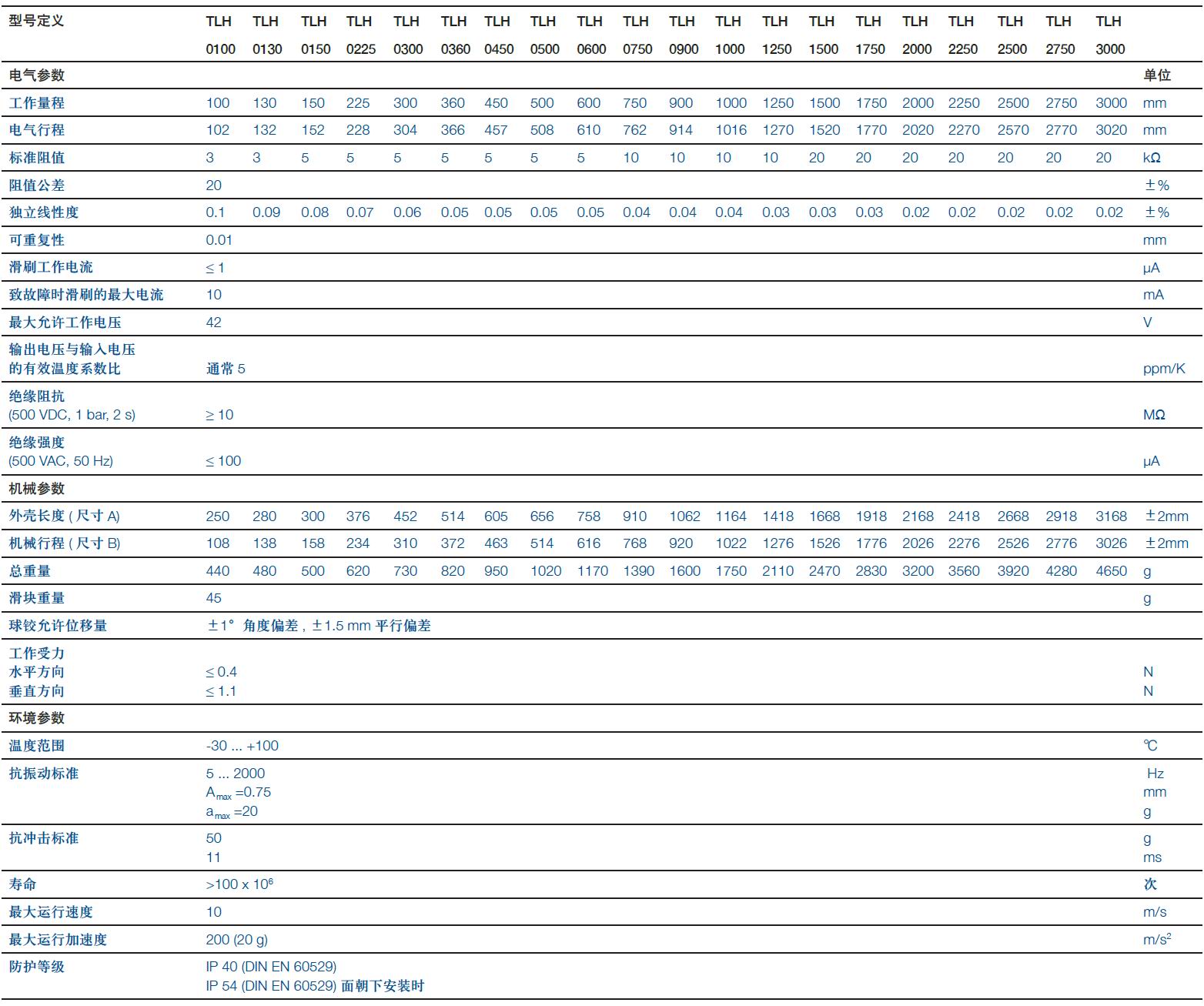 TLH系列傳感器直線位移傳感器,主要用于控制、調節和測量系統中對位移和長度的直接精確測量。無拉桿設計使傳感器滑刷在傳感器側面,沿傳感器長度方向移動,避免了一般傳感器常見的由于“泵”效應引起的傳感器失效問題,并且行程可達3000毫米。新穎的球鉸使由于不平或傾斜產生的扭力得到釋放,傳感器的承受拉力均勻。安裝卡具可以進行微調。基于材料和工藝的關系,傳感器的溫度系數極低。堅固的結構和材料使傳感器可以在惡劣的溫度和震動條件下可靠工作。傳感器測量原理簡單,無源以及絕對值輸出使得它不受外界的電磁影響,同時它不需要內置電源,能在斷電時保持實時位移數據。 特點: ? 無桿設計 ? 球鉸結構可避免側向載荷 ? 不同應用條件下,使用壽命長達100 x 106次 ? 線性優異,高達±0.02% ? 分辨率高于0.01mm ? 運行速度高 ? DIN 43650標準插頭和插座 ? 面朝下安裝時,防護等級IP 54。