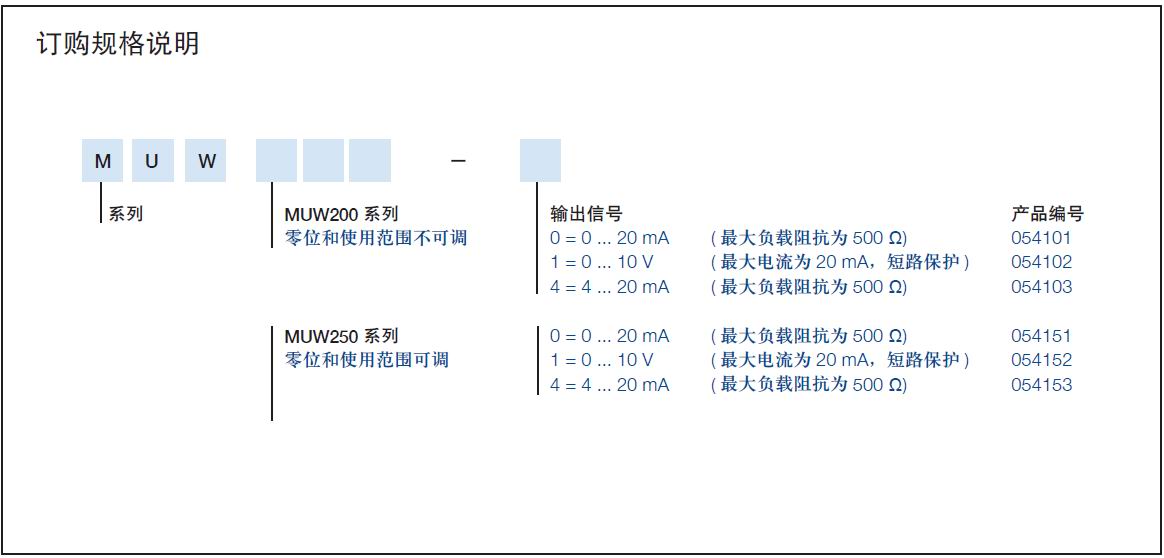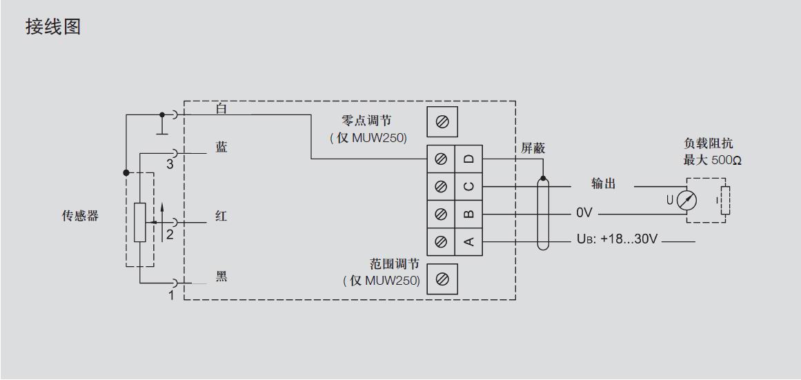 信號模塊MUW250,專為 LWH 系列和 TLH 系列位移傳感器配置,標準插座式安裝,可與任意電子尺連接使用 ,內部采用高精度隔離和信號模塊 ,輸出訊號上下限可微調 ,輸出訊號可選擇0-10V,4-20mA。該信號轉換器提供一個非常穩定的恒定電壓給位移傳感器,傳感器滑刷上的信號來自無負載的高阻抗輸入端,此信號能被轉換成與所測位移成正比例關系的標準信號輸出。信號轉換器所具有優良的線性度、極低的溫漂以及與傳感器相匹配的信號處理方式等,保證位移傳感器在使用過程中具有杰出表現;即便在信號傳遞距離很遠的工況下,也能保證傳遞的可靠性和抗干擾。
