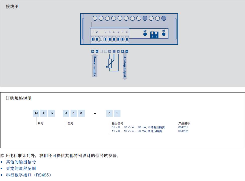 MUP400專為位移傳感器配置的電腦控制接口模塊,簡單的Teach-in功能,適合移動電位計傳感器連接,高于/低于理論測量范圍 德國原裝產品,高速測量刷新速率-可達7.5kHz,電氣隔絕屏蔽可選 (DC/DCtransformer),24位Sigma-Delta-AC轉換器,標準輸出信號:0 ... 10 V;4...20mA。極低的溫漂(20 ppm/K),標準導軌固定安裝,符合DIN EN 50022標準。