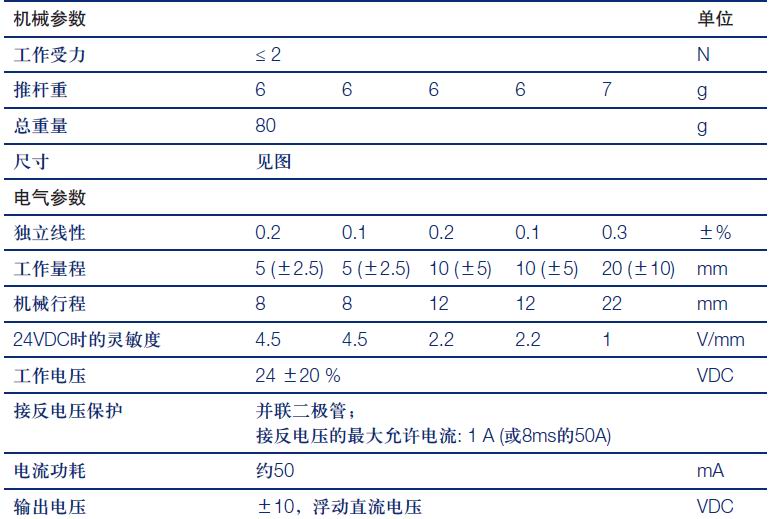 F200g系列傳感器直線位移傳感器,F(xiàn)200型是一種電子位移傳感器,它可通過一種帶可移動鐵芯的差動變壓器把較小的直線位移轉(zhuǎn)換成電模擬信號。鐵芯安裝在推桿上,推桿由內(nèi)置彈簧壓緊靠住被測物體或與被測物體緊密連接。傳感器由直流電壓供電。高度集成的內(nèi)置電源模塊為差動變壓器提供穩(wěn)定交流電壓。鐵芯位移產(chǎn)生相應(yīng)的直流輸出電壓,位移的變化就通過電壓的變化計算得出。電氣零位位于推桿有效量程的中間。