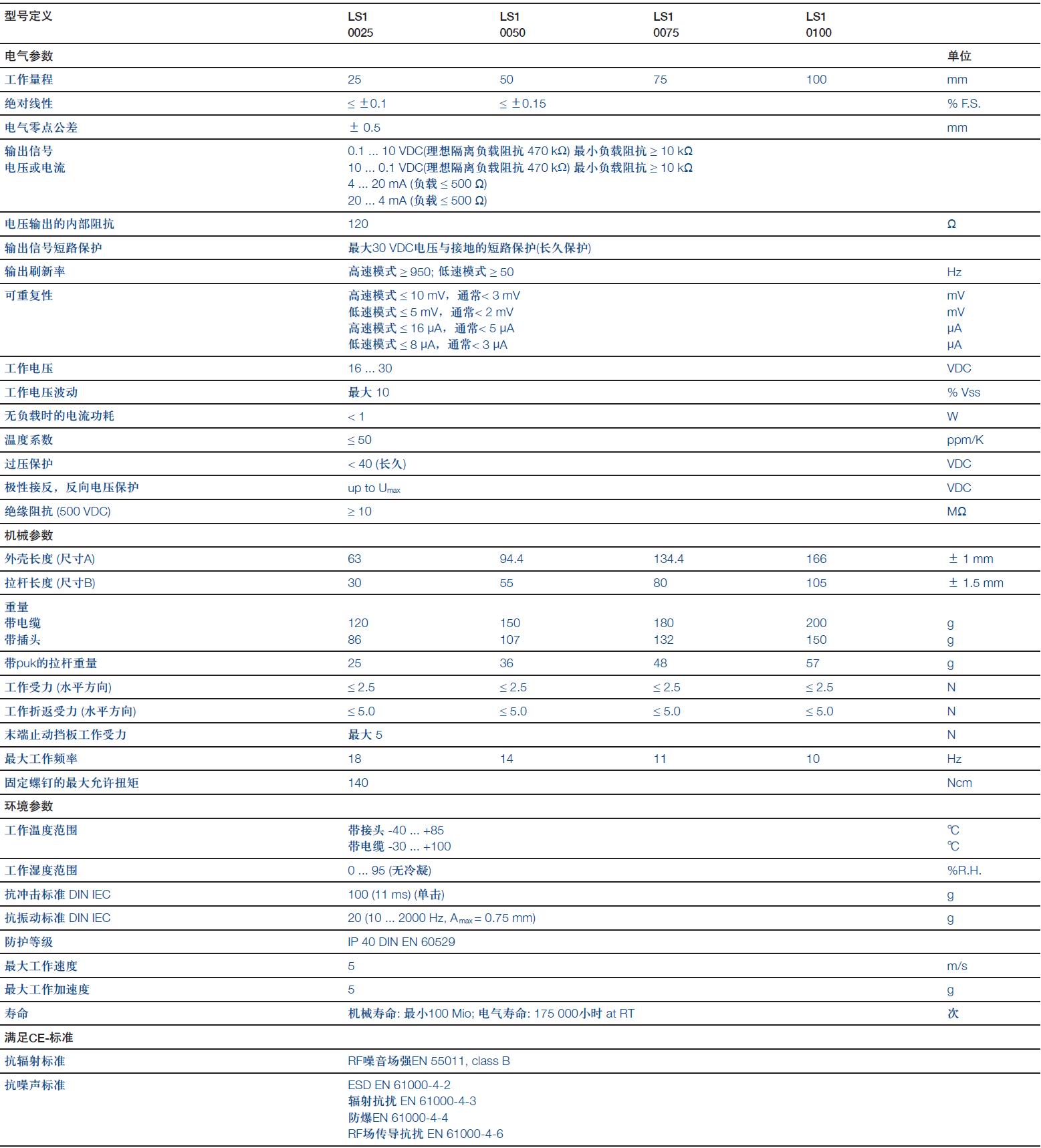 LS1系列直線位移傳感器非接觸式電感測量原理,NOVOPAD測量技術,模擬量接口,帶復位彈簧,工作量程可達100 mm。該產品型號:LS10025、LS10050、LS10075、LS10100。