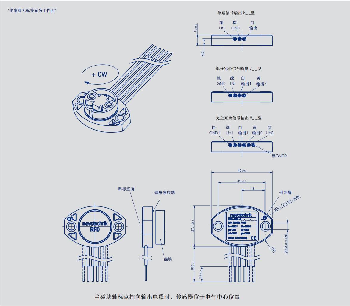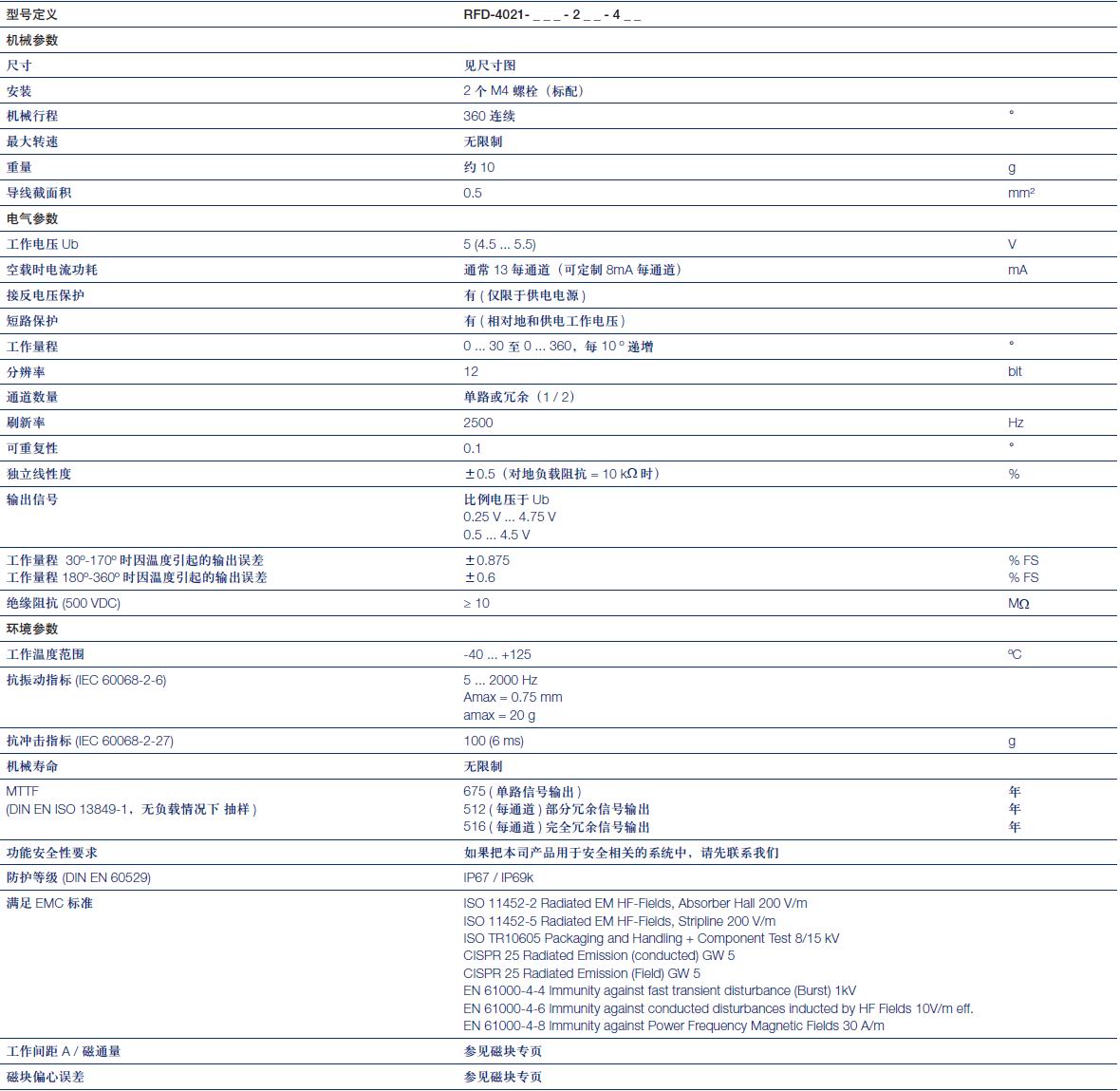 RFD4000系列角度傳感器,NOVOHALL 原理,非接觸式,無磨損,空間測量,模擬量輸出,該傳感器通過感知磁場方向的變化,來確定需要測量的角度。一般情況,客戶提供的轉動的機件軸上裝有磁塊,機件軸轉動造成磁場方向變化,該變化被傳感器的集成電路反應出來,經過計算得出模擬量的角度信號輸出。傳感器外形小巧,可以應用于非常狹窄的安裝空間。傳感器外殼由高等級耐高溫塑料制成,傳感器完全密封,適用于灰塵、污垢或潮濕等惡劣環境。RFD 系列傳感器由磁塊和傳感器兩部分組成,最大程度方便客戶安裝和維護。磁塊和傳感器之空間允許存在非磁性介質進行空間測量。信號輸出通過密封于傳感器內部的鍍錫導線實現。產品應用:加工機械、制造業、紡織機械、包裝機械、金屬加工機械、繞線機械自動化技術領域、醫療機械、 移動工程機械、工業卡車、建筑機械、農林機械、海洋設備。