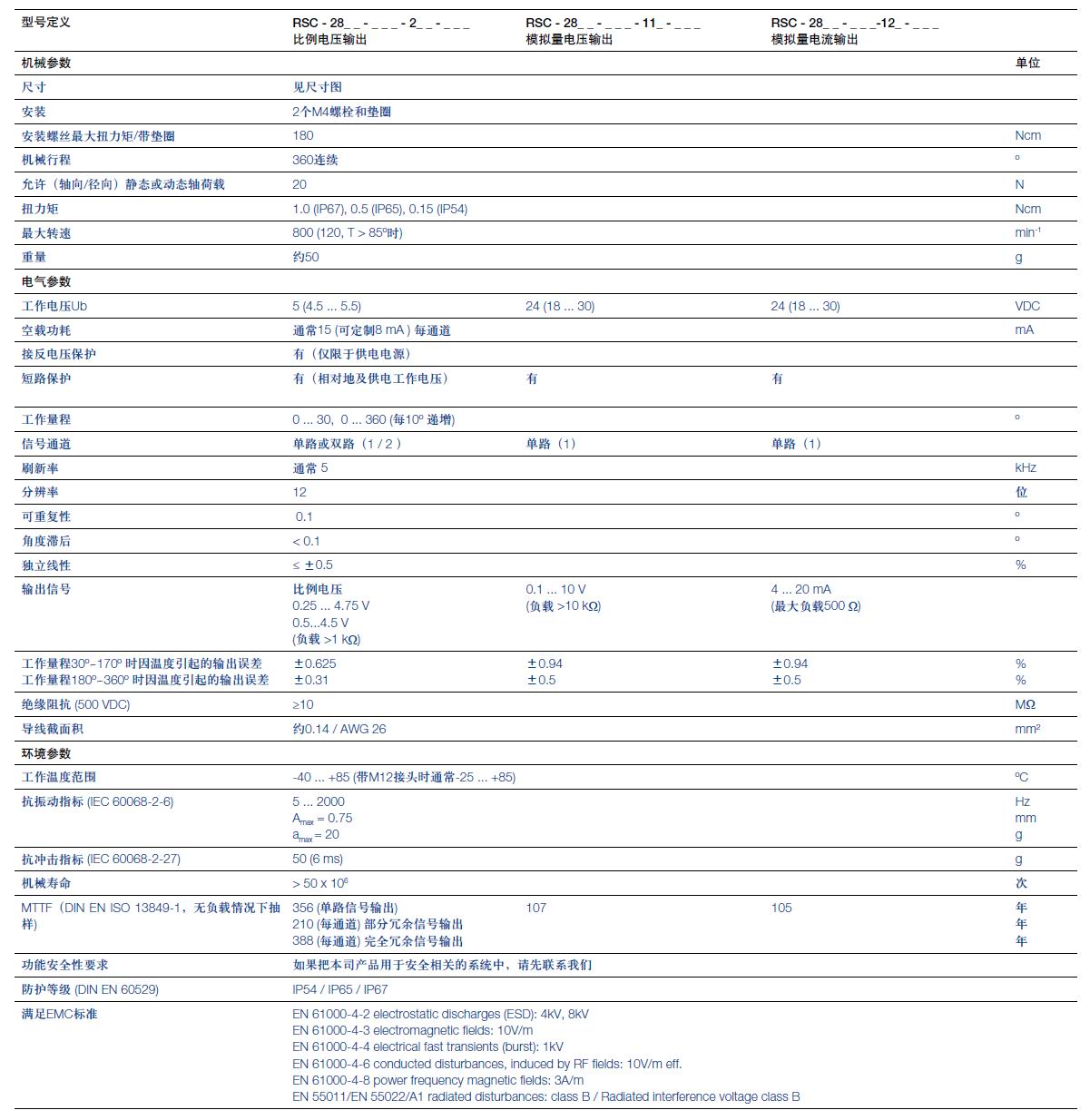 RSC2800系列角度傳感器NOVOHALL原理,非接觸式模擬量、數字量輸出,非接觸式傳感器通過測量磁場方向的改變來確定測量的角度。轉軸上轉動的磁塊導致磁場方向的改變,傳感器電路捕獲磁場方向的變化,并將其轉化成對應的角度以模擬量信號(電流或電壓)、SSI、SPI 和增量輸出。傳感器外殼由高等級耐高溫塑料制成。增長導槽固定,只需簡單調整機械結構,即可輕松安裝。獨特的插按式彈簧連接,保證安裝快捷,傳感器不受灰塵或潮濕影響。信號輸出通過機殼內引出的密封屏蔽電纜實現。可定制M12 接頭連接方式。產品應用:? 通用工程制造? 移動工程車輛。