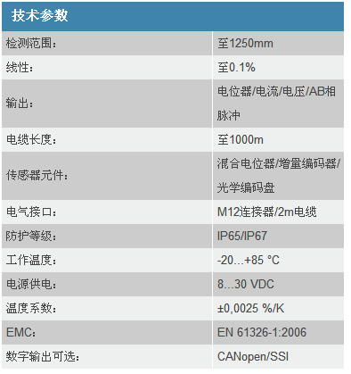 德國WAYCON拉繩位移傳感器:量程0-50mm...50M;線性度:+/-0.5%....0.02%;輸出信號:模擬量,增量脈沖,總線輸出。拉繩位移傳感器SX50,量程0-50mm...1250mm;線性度:+/-0.5...0.02%;輸出:4-20mA/0-10V/CANOPEN/SSI。型號舉例:SX50-250-420A-SA-o、SX80-2000-420A-SA-o、SX80-3000-420A-SA-o、SX50-250-420A-KA、SX50-500-420A-KA、SX50-1250-420A-KA、SX80-1500-420A-KA、SX80-2000-420A-KA、SX80-ZB2000-420A-KA、SX80-3000-420A-KA、SX120-5000-420A-KA、SX120-5000-10V-KA、SX135-10M-420A-KA、SX135-20M-420A-KA、SX50-50-420A-SA-O、SX50-1000-420A-KA-L05;