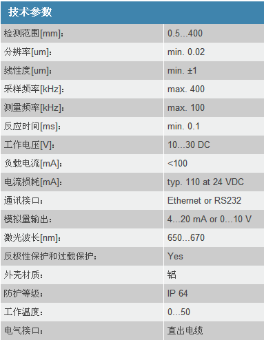 德國WAYCON激光位移傳感器,量程:0-0.5mm...150M;準確度:+/-1um;響應頻率:37KHZ 最大;輸出信號:模擬量,總線輸出。 激光位移傳感器LAM,測量范圍 :...400 mm ;分辨率: 0,0002mm ;準確度: +/-0.001mm ;響應頻率: 10KHZ,37KHZ。 應用:軋鋼產品厚度檢測、輪軸中心定位、前輪定位、圓度品質檢測、軸向/徑向跑偏檢測、紙、橡膠以及塑料處理、檢測灼熱的物體、高動態過程測量。