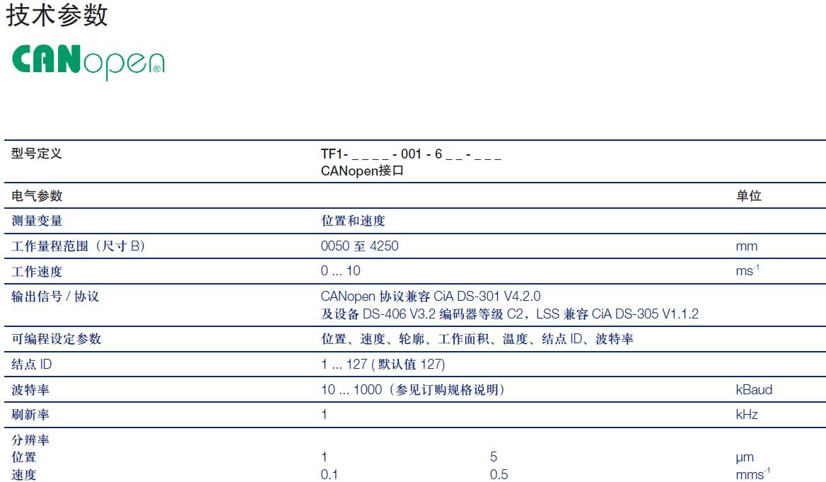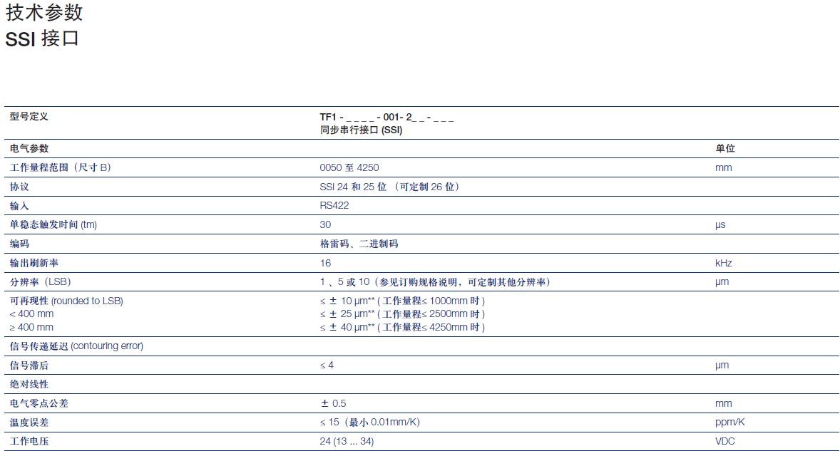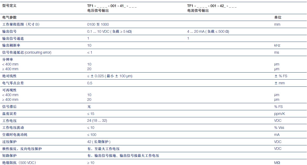 TF1系列直線位移傳感器非接觸式電感測量原理,NOVOPAD測量技術;工作量程可達1000 mm;產品應用:生產制造機械領域、注塑、壓鑄、擠壓機械、紡織機械、包裝機械、金屬折彎、成型機、木工機械、自動化技術領域。 產品特點: ?電感式測量原理 ?抗磁場干擾 ?無機械磨損,無限的機械壽命 ?工作速度快,刷新率達10 kHz ?分辨率達1 μm ?可再現性達 2 μm ?防護等級IP67 ?允許磁塊偏移運動中心線±2 mm ?溫度系數<15 ppm/K ?抗沖擊或振動的性能優異 ?電氣行程可調(Teach-In) ?可選電壓隔離型產品 ?輸出接口可選:模擬量、SSI、CANopen和IO-Link。